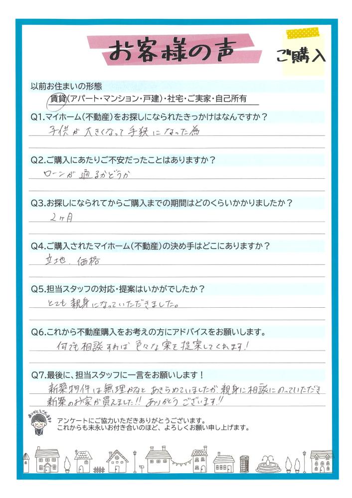 新築物件は無理かなと、あきらめていましたが、親身に相談にのっていただき、新築のお家が買えました!!ありがとうございます!!